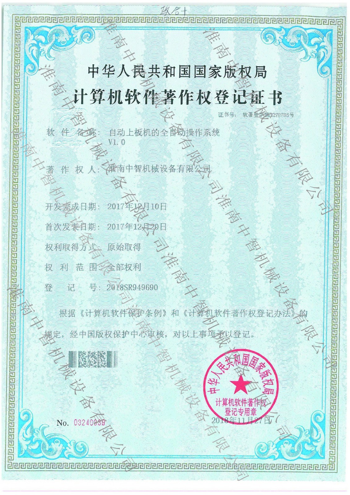 淮南九游网机械自动上板机全自动操作系统专利证书