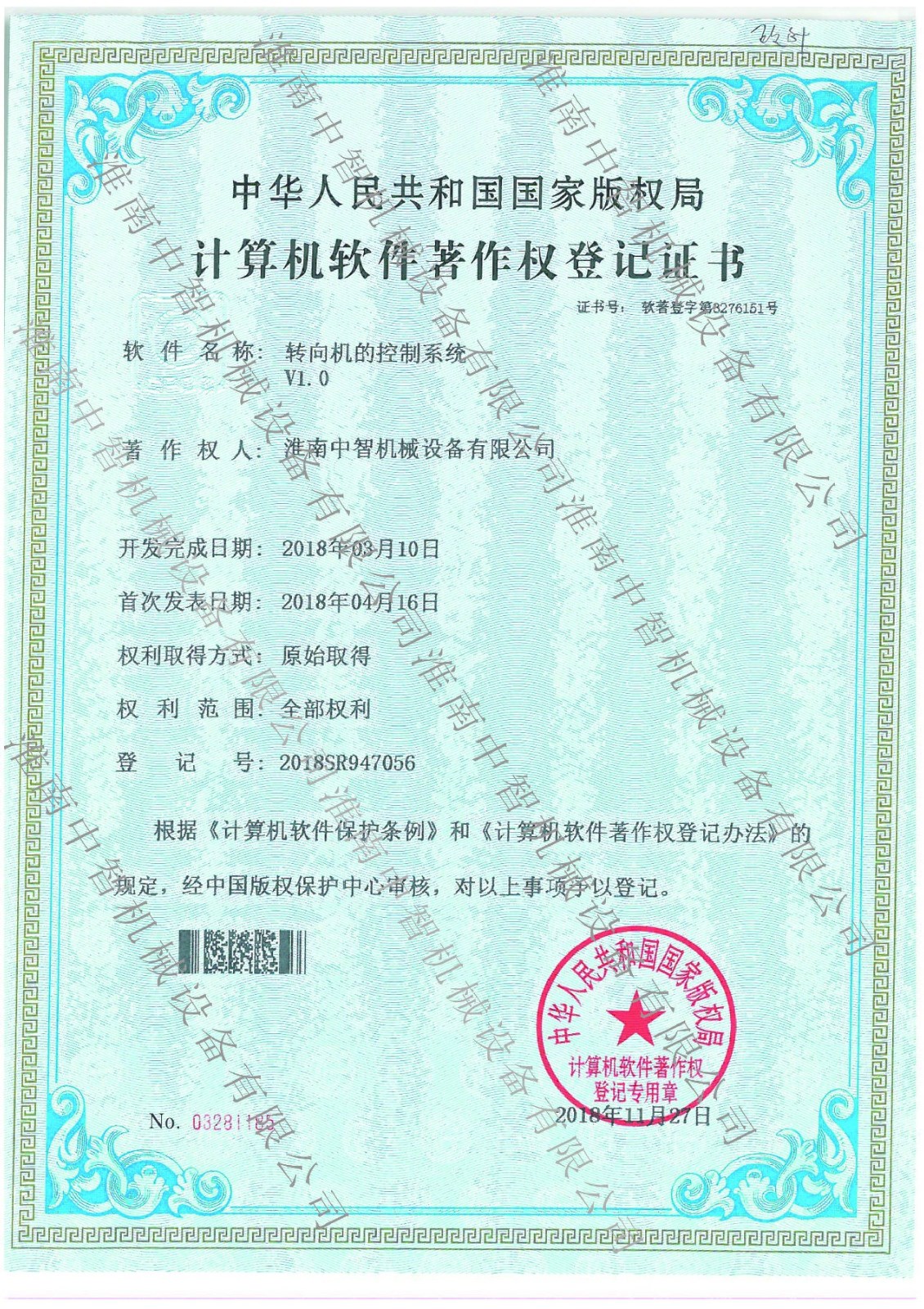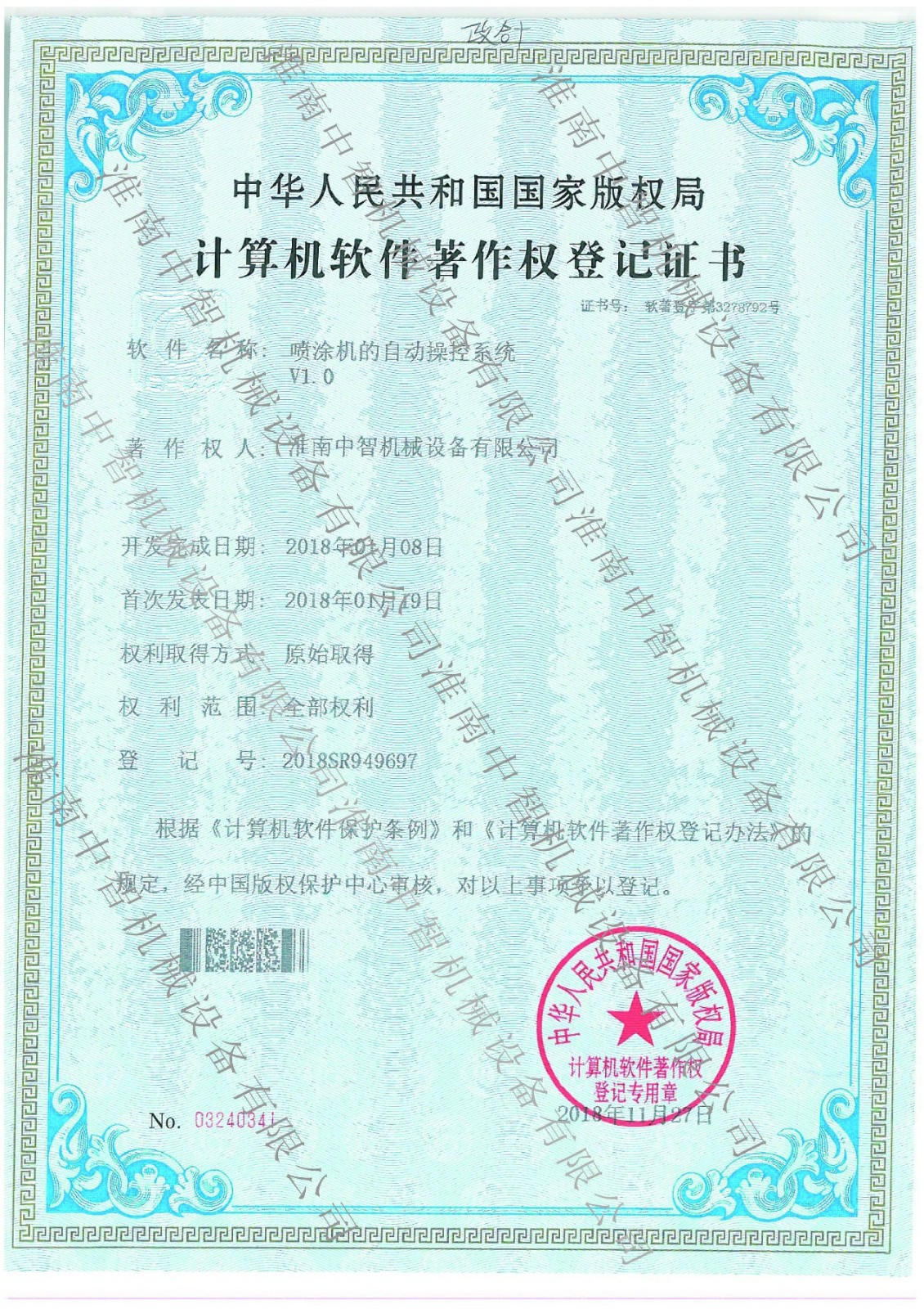 淮南九游网机械喷涂机的自动操控系统专利证书