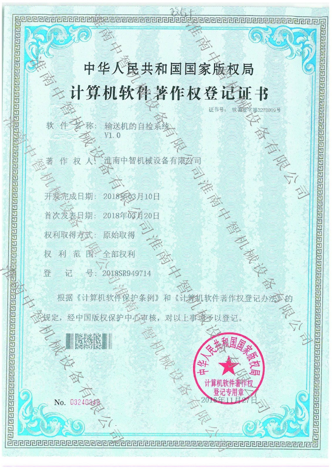 淮南九游网机械输送机的自检系统专利证书
